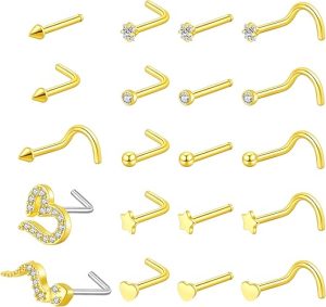 The Tornito nose ring set includes 20 pieces in various secure‑fit designs (L‑shaped and screw types) — ideal for daily wear and those who want backup options.